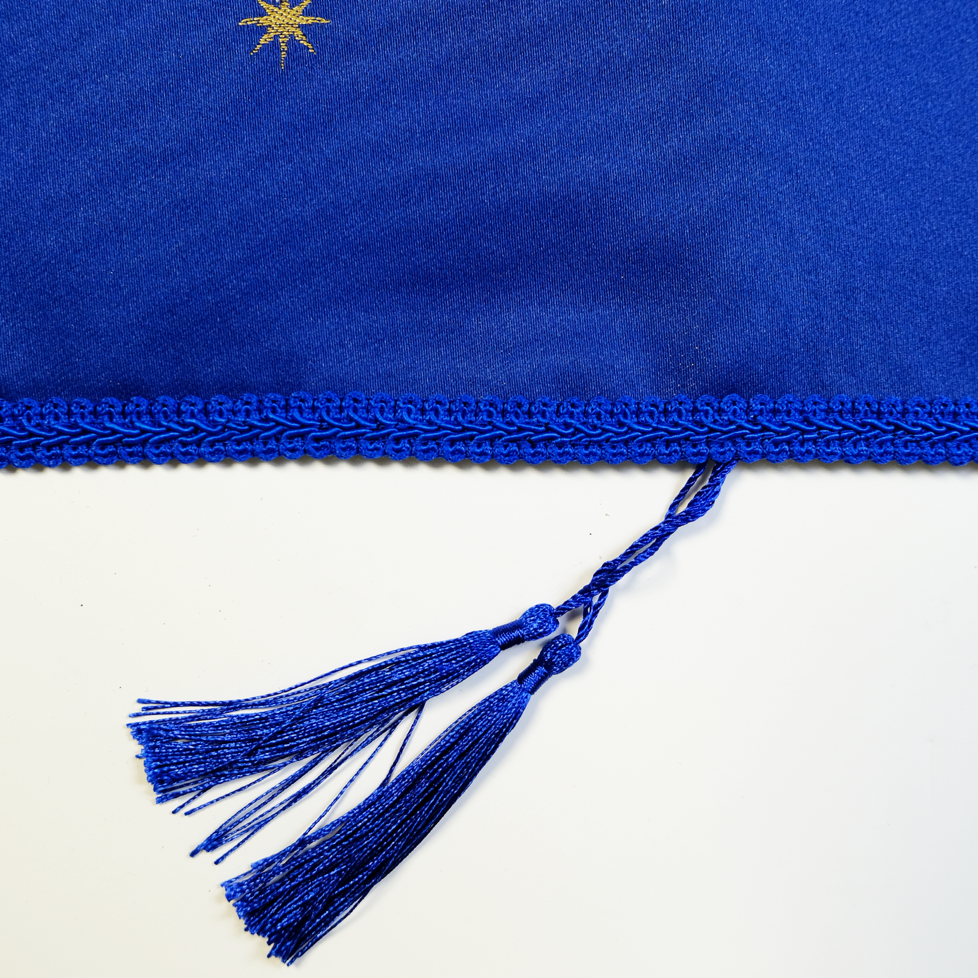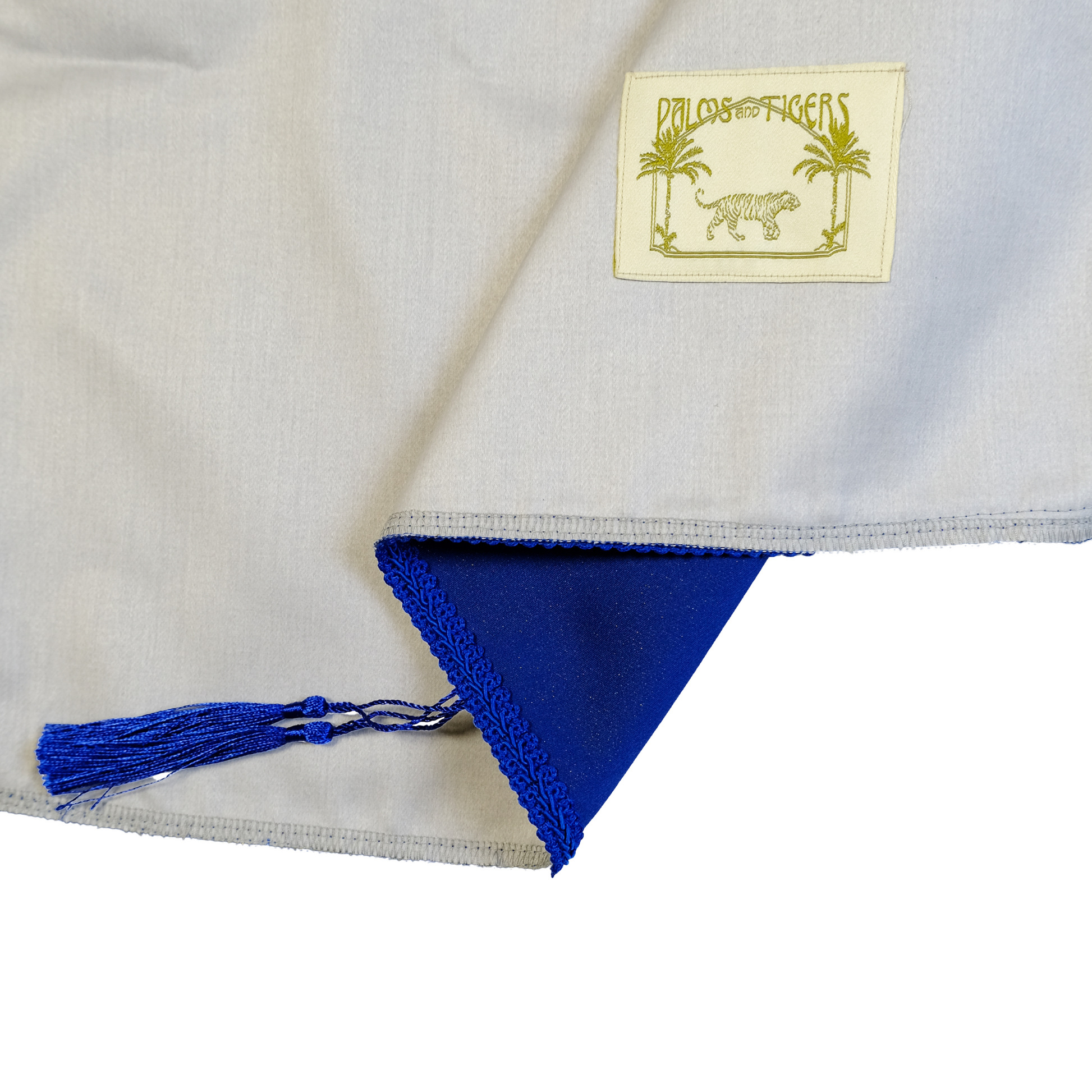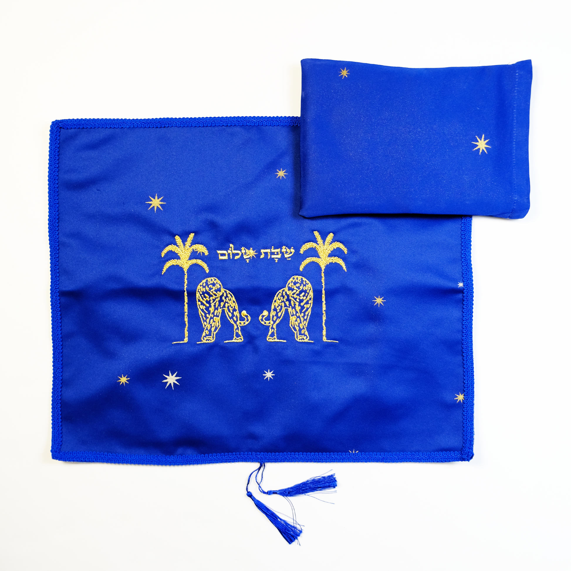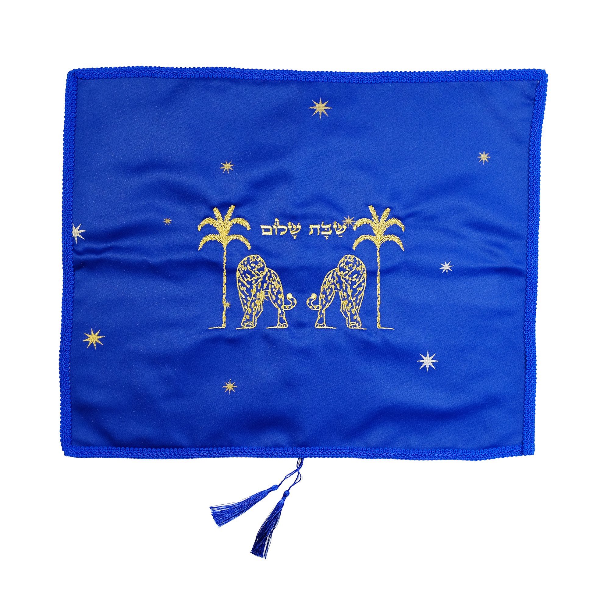 • Challah cover in an original design, locally made, crafted from blue fabric with golden embroidery of tigers, palm trees, and stars, featuring the inscription“Shabbat Shalom” • Finished with blue tassels and a durable white satin lining • Add a unique touch to your Shabbat table • A perfect gift for every Jewish home • Size:55 × 45 cm • Each cover is unique; slight variations may occur between pieces