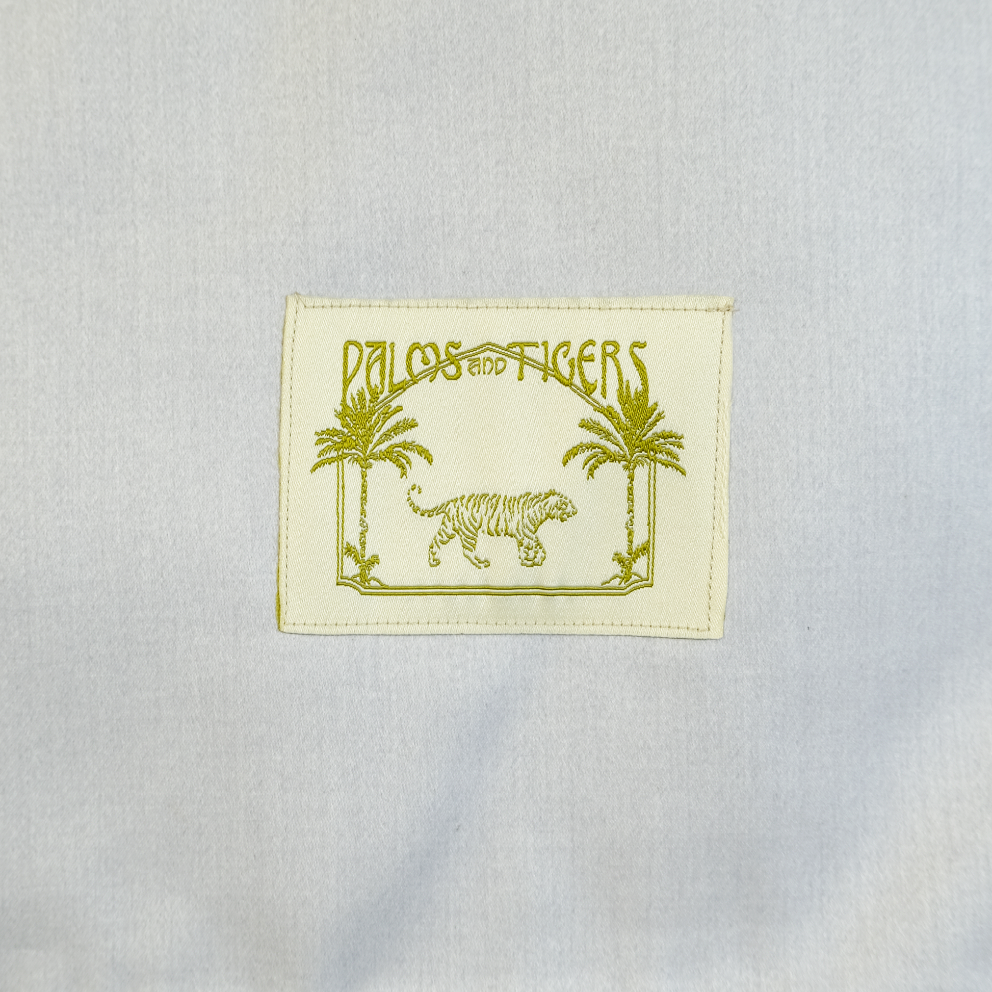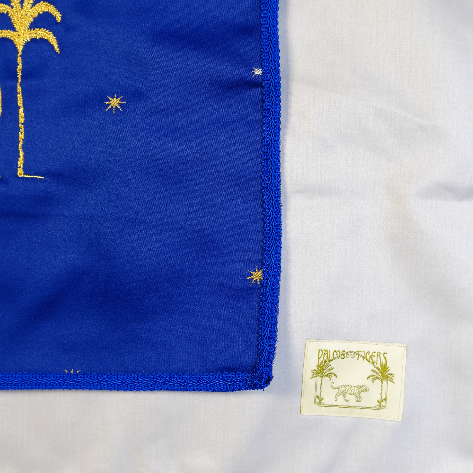 ·כיסוי חלה בעיצוב מקורי וייצור מקומי עשוי בד כחול עם רקמה זהובה של נמרים, דקלים וכוכבים עם הכיתוב ״שבת שלום״. לכיסוי גדילים בצבע כחול ובטנה מסאטן עמיד
