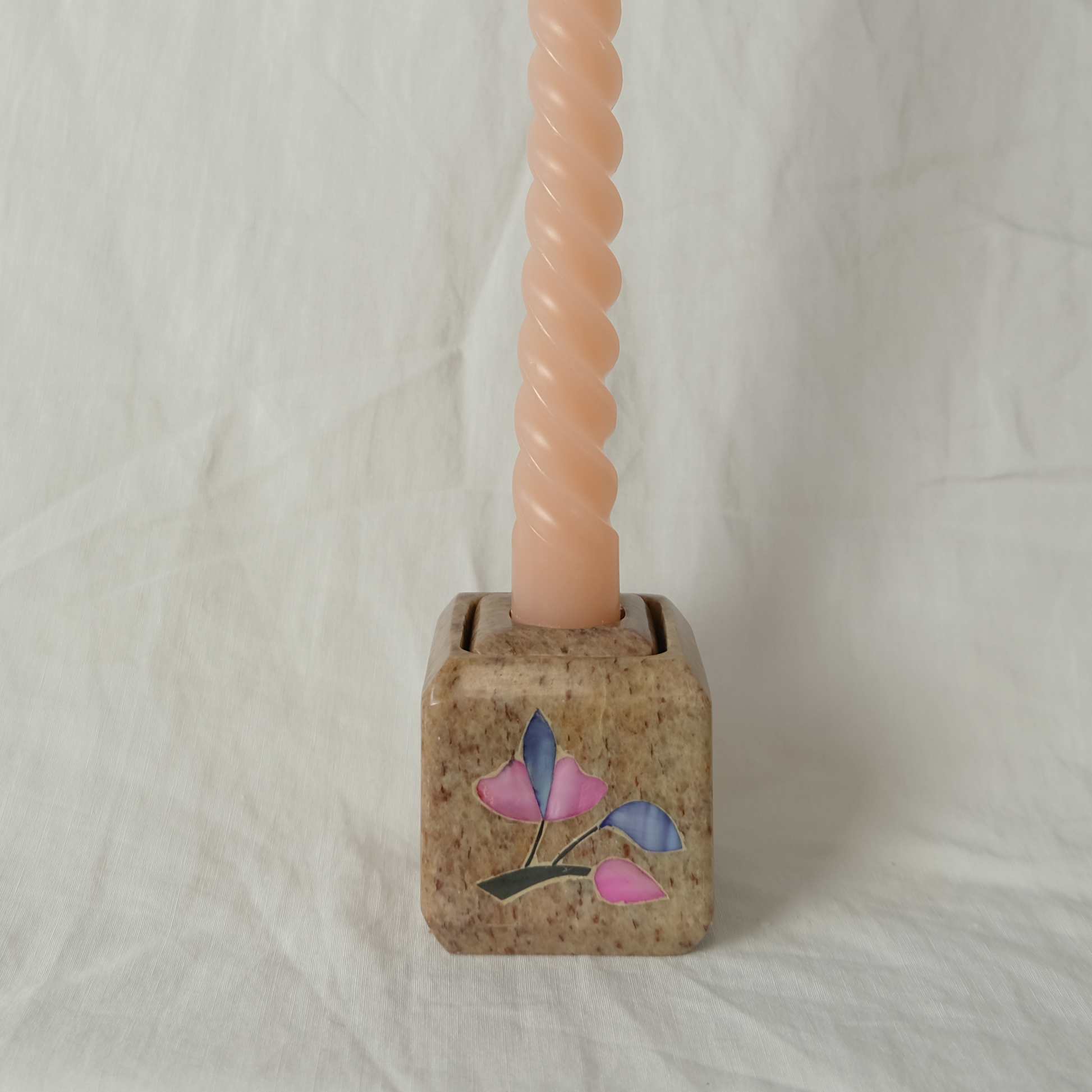 פמוט מרובע עשוי שיש טבעי בגוון ורוד, על פאה אחת שלו מוטבע פרח בצדף מבריק. בתוך הפמוט ישנה קוביה להעמדת הנר במידות שונות. בחרו את גודל הנר שתרצו וסובבו את הקוביה לחור בגודל המתאים.