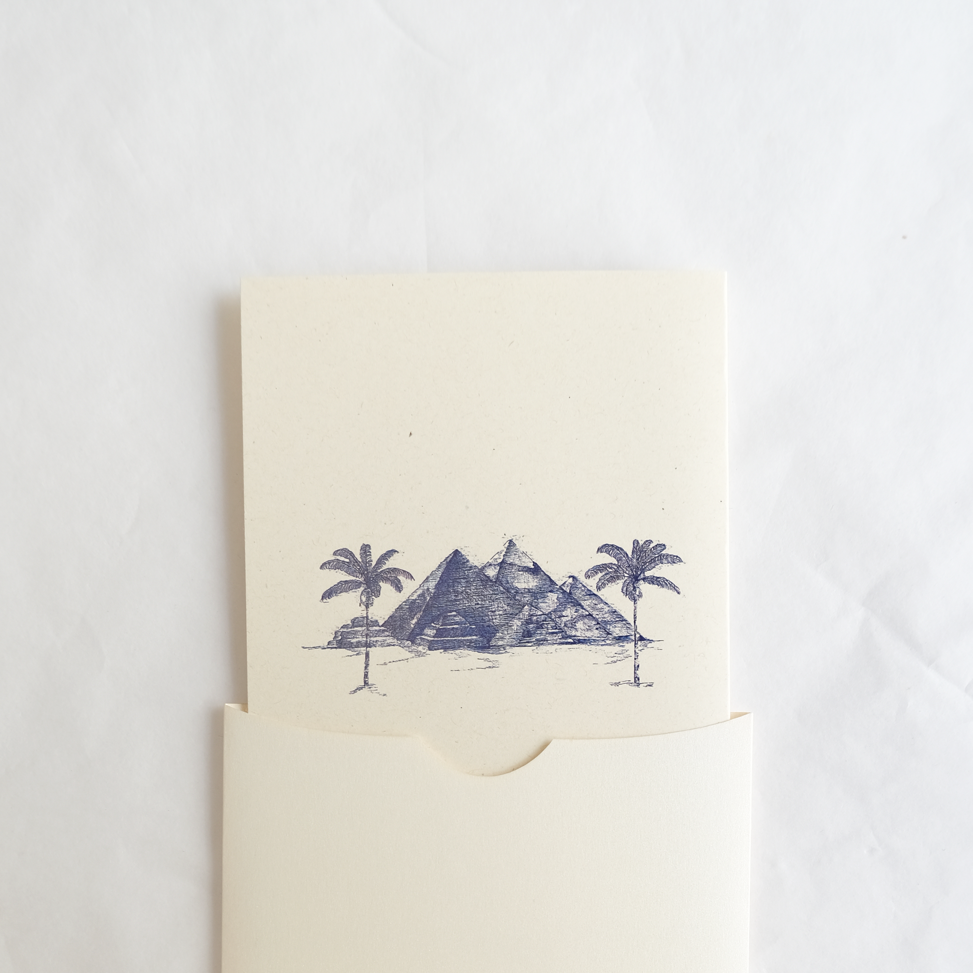 כרטיס ברכה במהדורה לפסח עם איור של פירמידות בכחול כהה