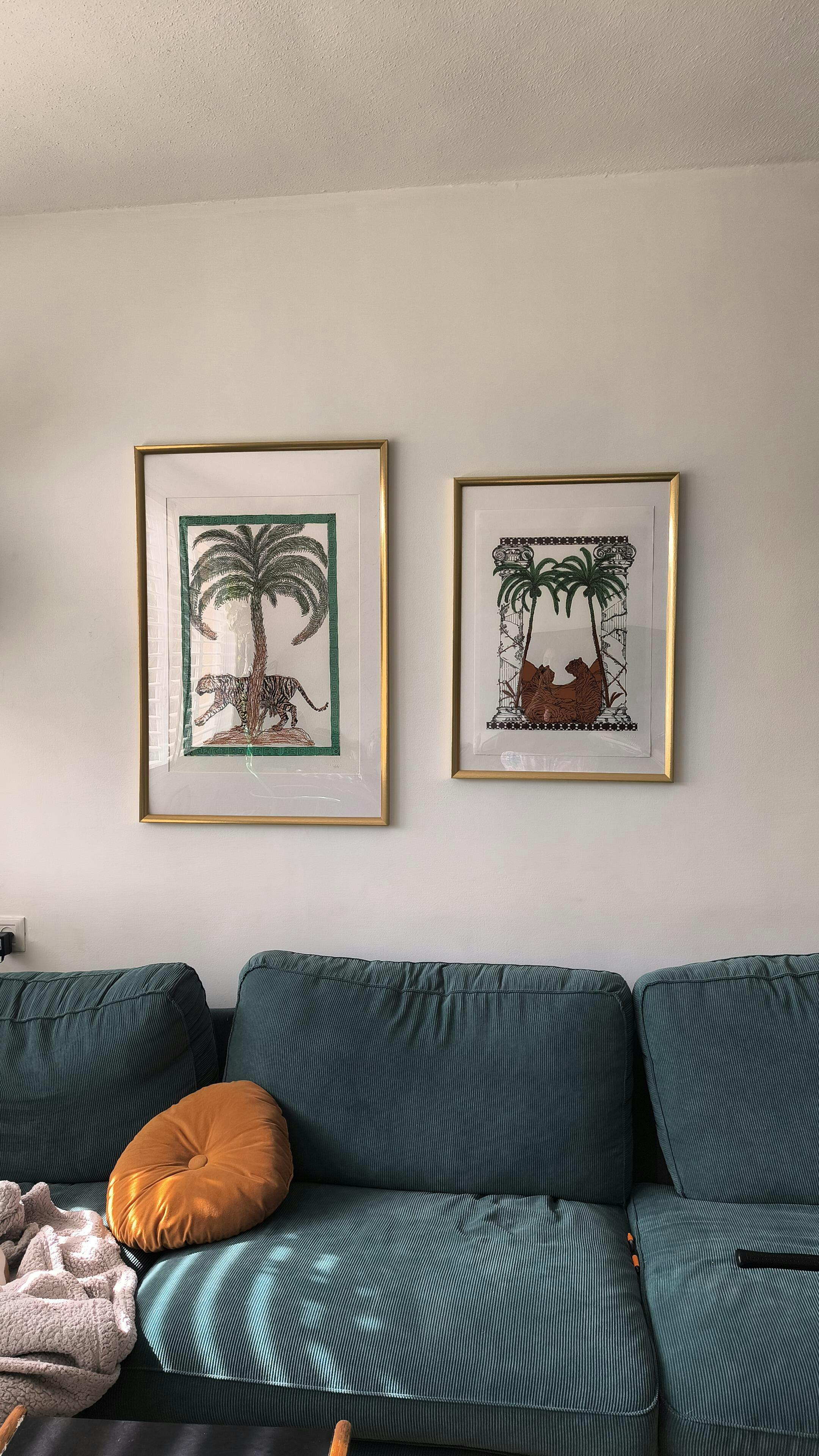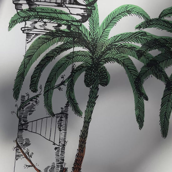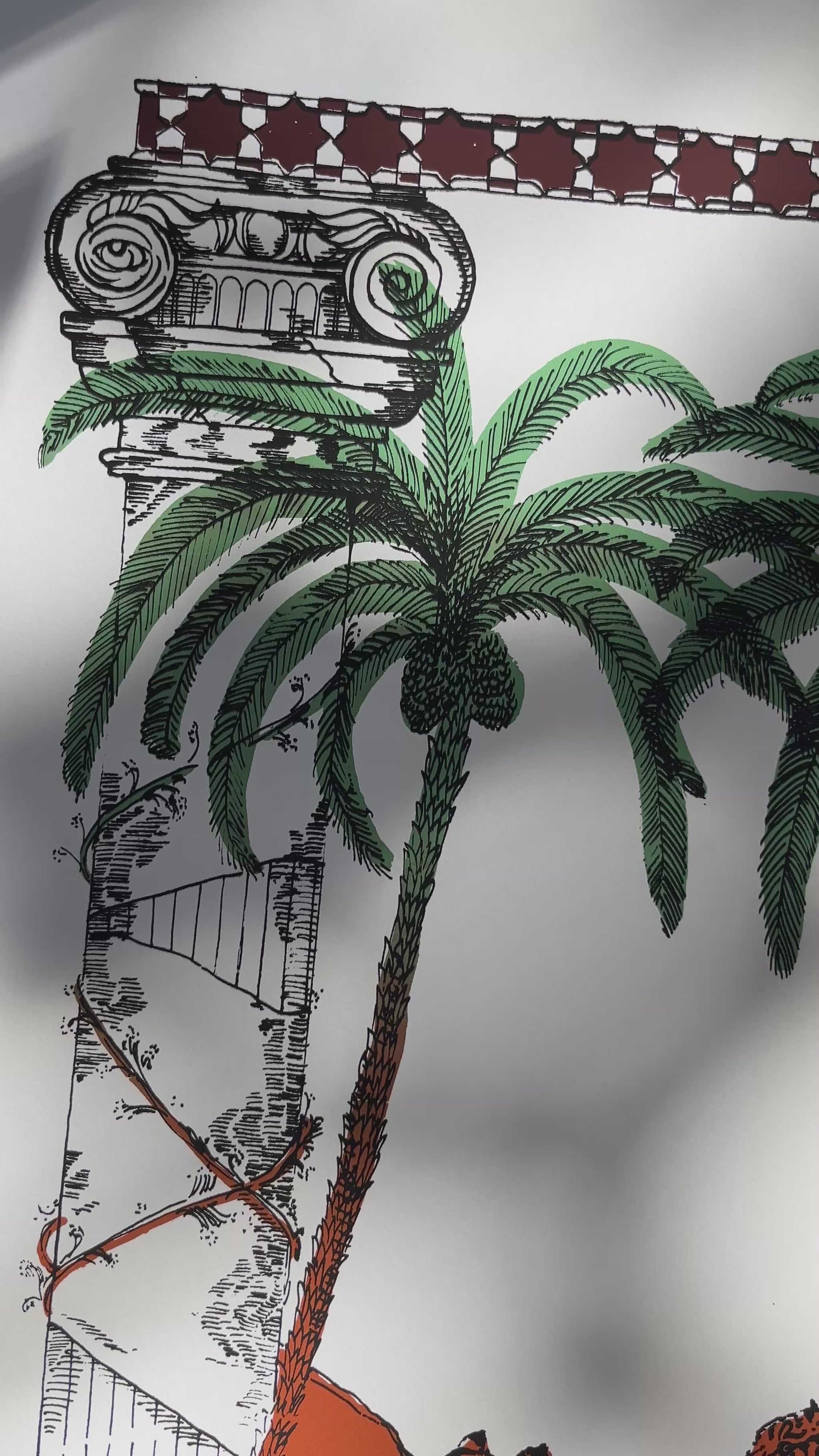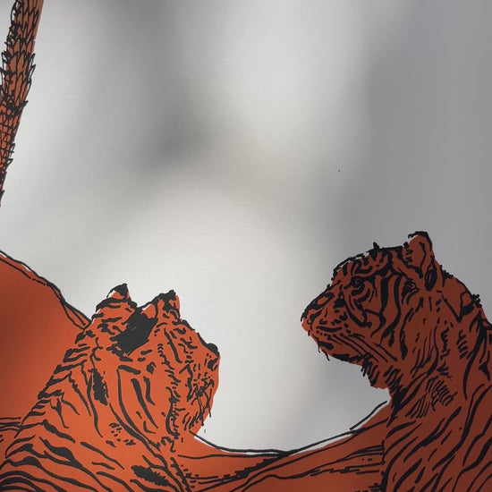 Discover our unique, limited edition screen print featuring a composition of tigers and palm trees, sitting in at the gate of an ancient temple, over looking a valley of mountains. This exclusive art piece is perfect for adding a touch of sophistication to any space.