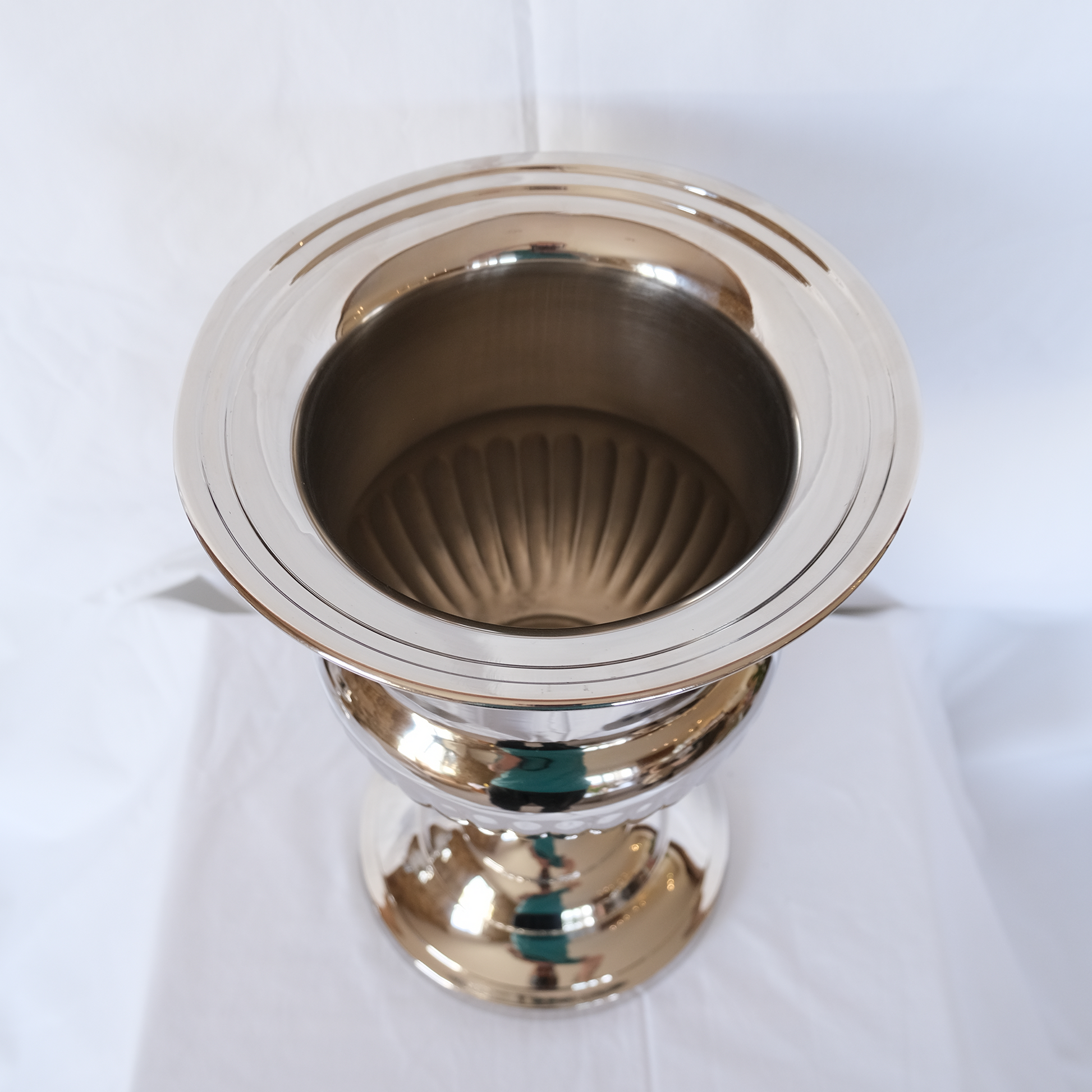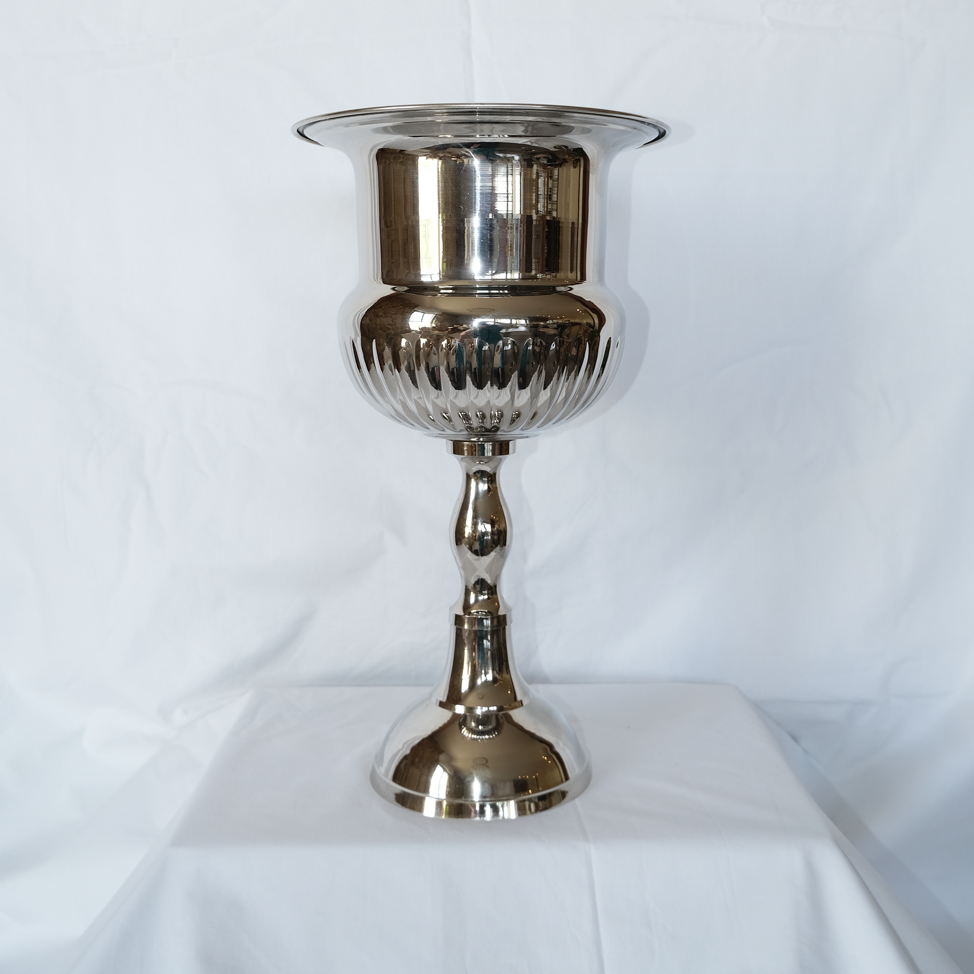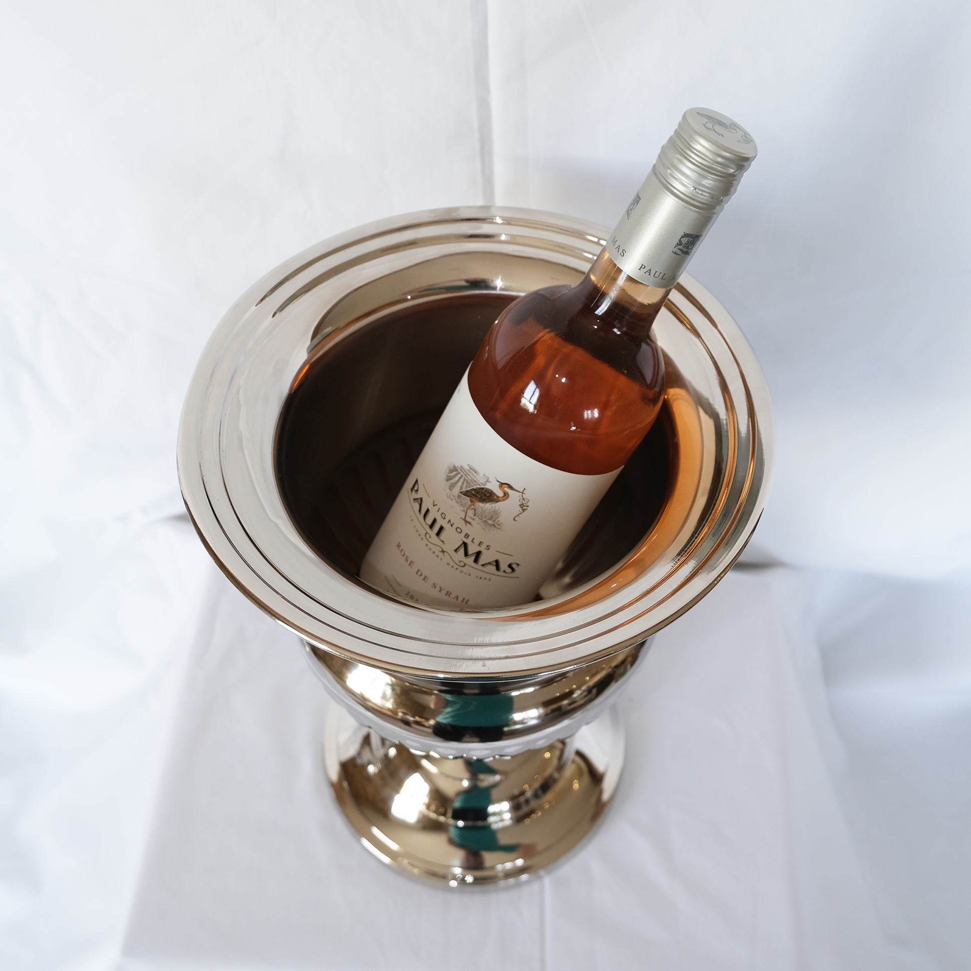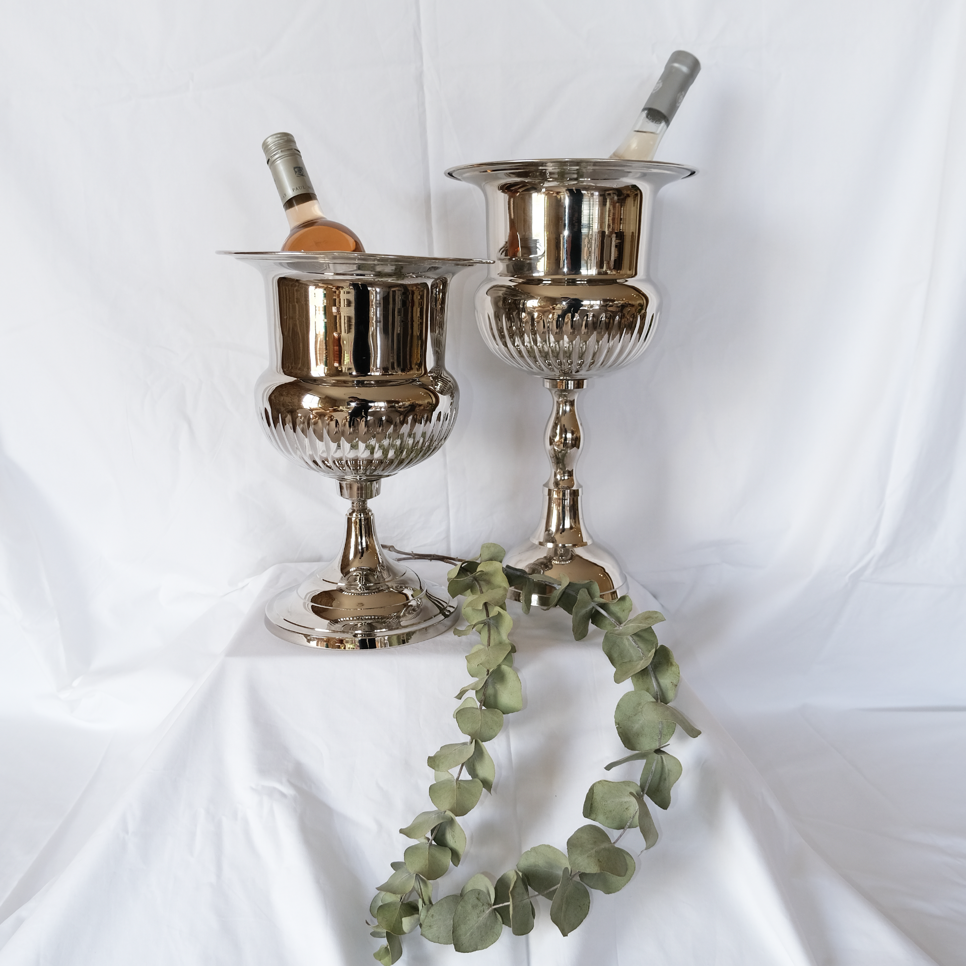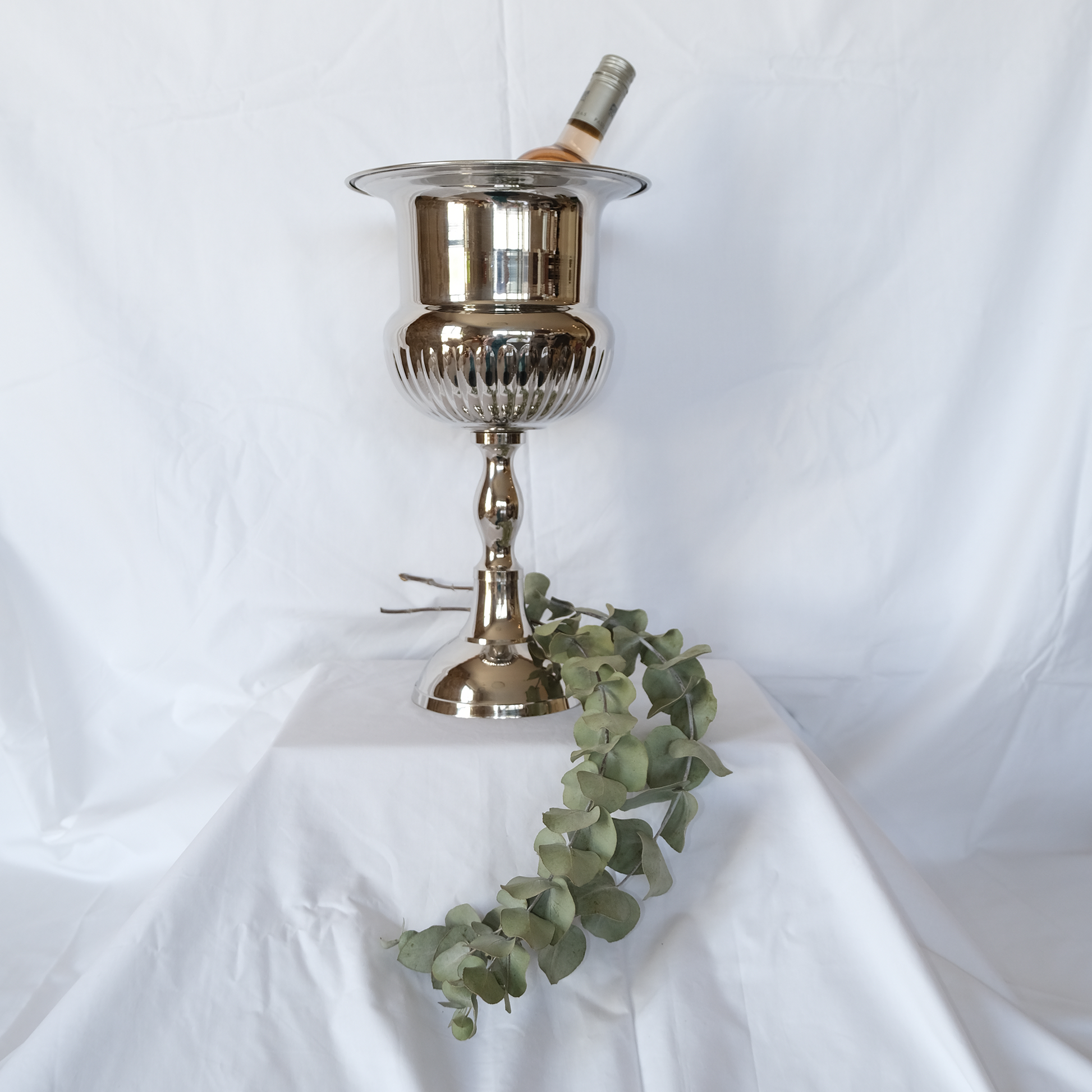 שמפניירה גדולה עשויה נחושת מצופה ניקל כסוף מבריק, מתאימה ל1-2 בקבוקי יין או לסידור פרחים מרכזי.