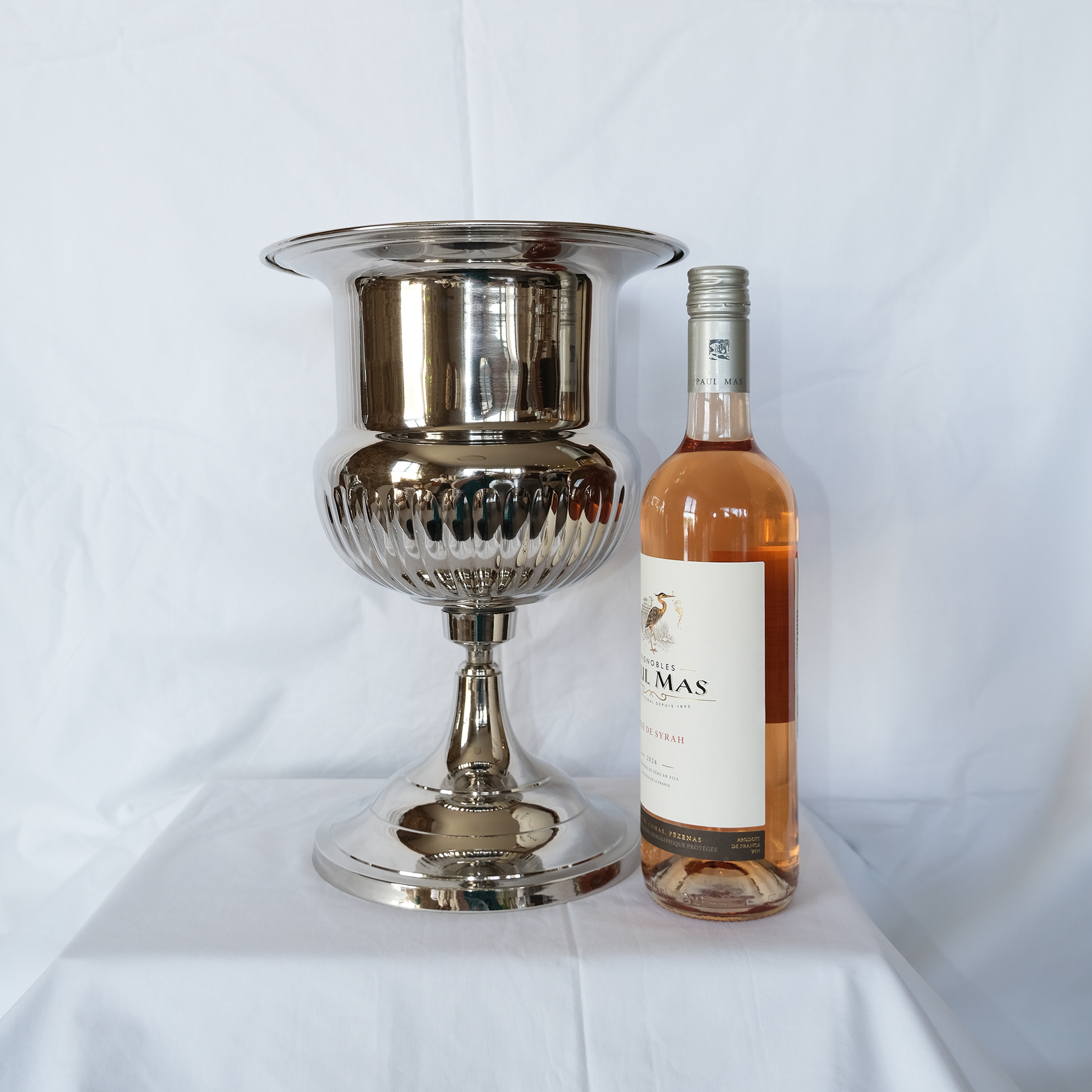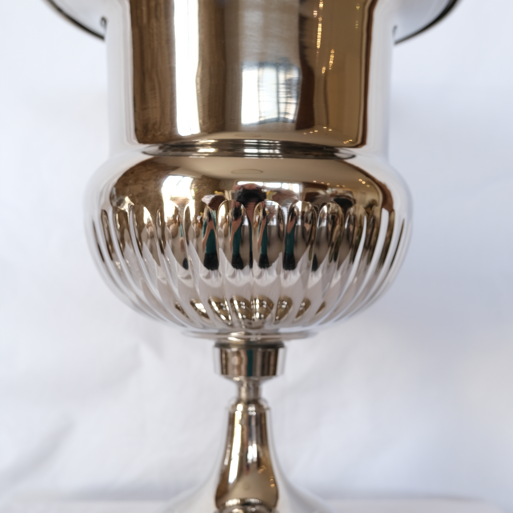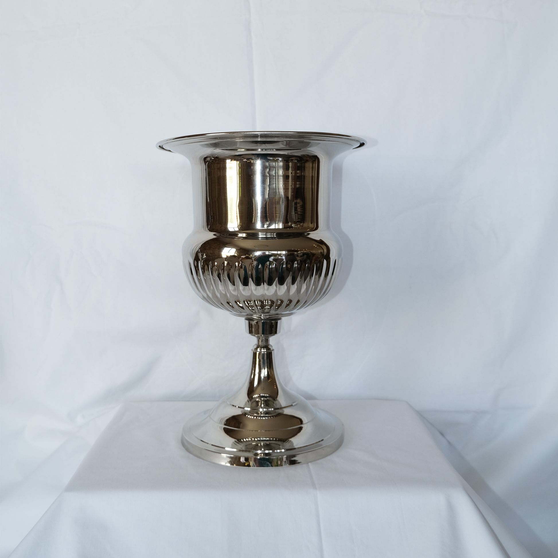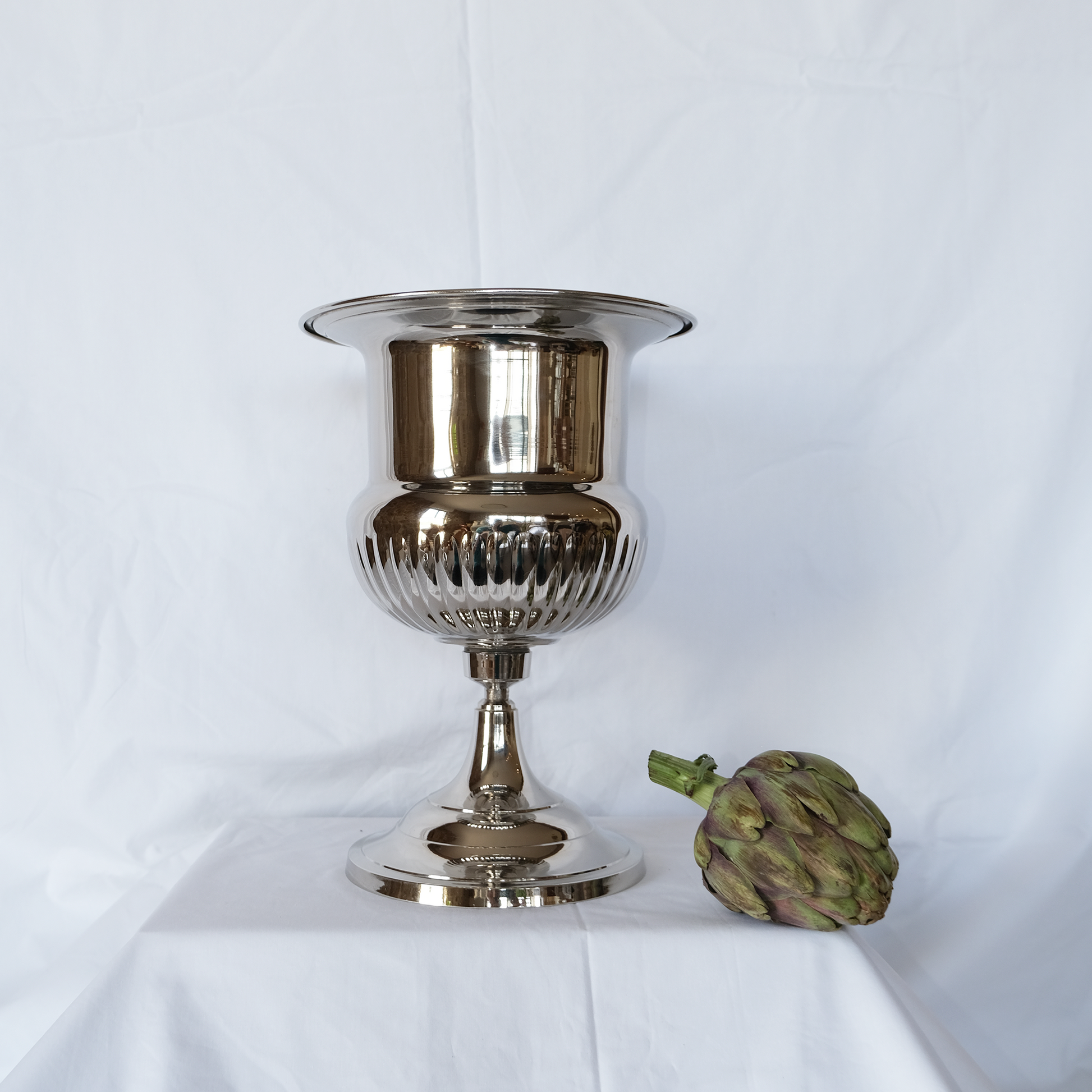 שמפניירה גדולה עשויה נחושת מצופה ניקל כסוף מבריק, מתאימה ל1-2 בקבוקי יין או לסידור פרחים מרכזי.