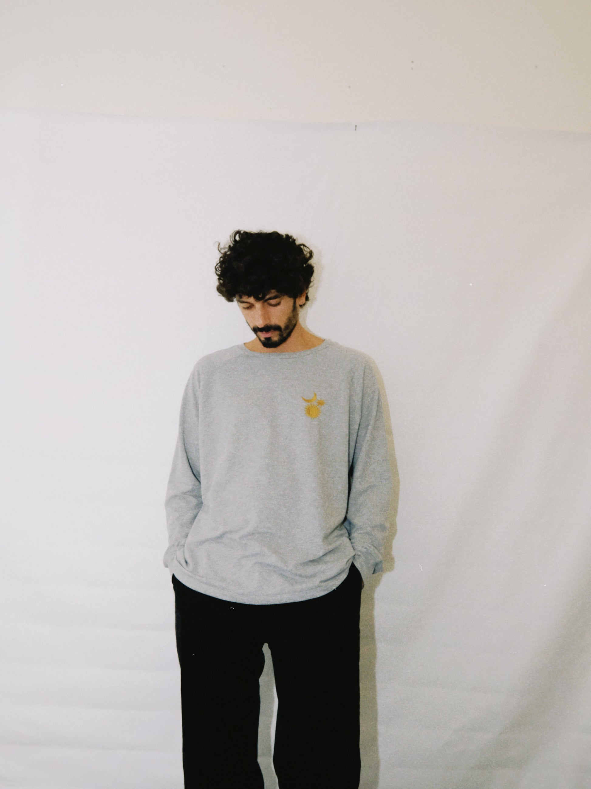 סווטשירט דק וארוך מפרנץ׳ טרי עם שרוול אמריקאי במידות אוברסייז בצבע אפור מלאנז׳ קלאסי עם רקמה מורכבת של שמש, ירח וכוכב בצבע זהוב. בד החולצה הוא רך ונעים ומתאים לאפשרויות סטיילינג מגוונות: מראה אוברסייז או בתוך המכנסיים.