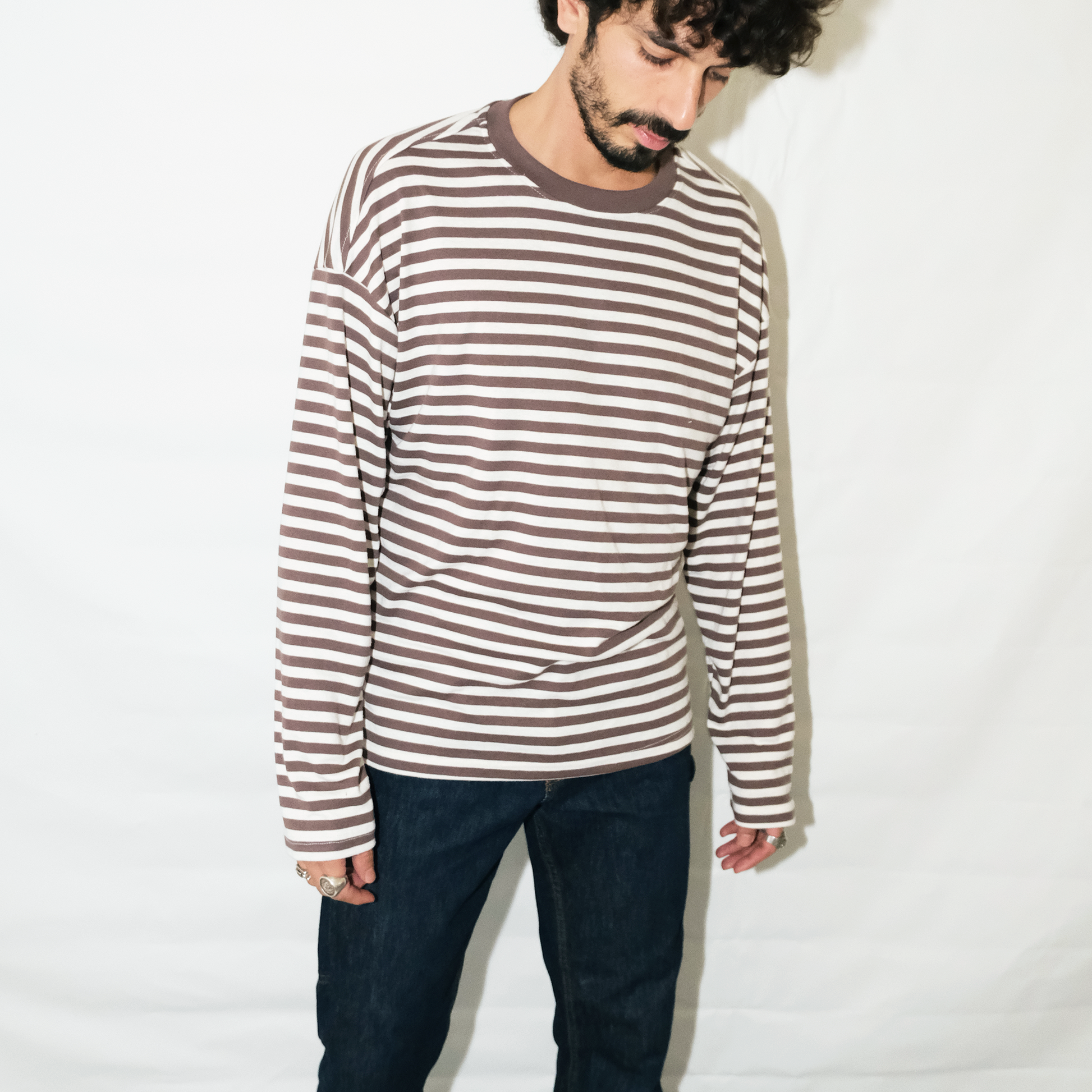 חולצת פסים ארוכה יוניסקס בגזרה מושלמת לסתיו עם שרוולים ארוכים במיוחד, מעט מתרחבים. אורך החולצה הוא רגיל ולא אובר סייז, קחו בהתאם למידה שלכם. עשוי בד דק ורך עם פאץ׳ תפור על שרוול שמאל בגוון ירוק זית.