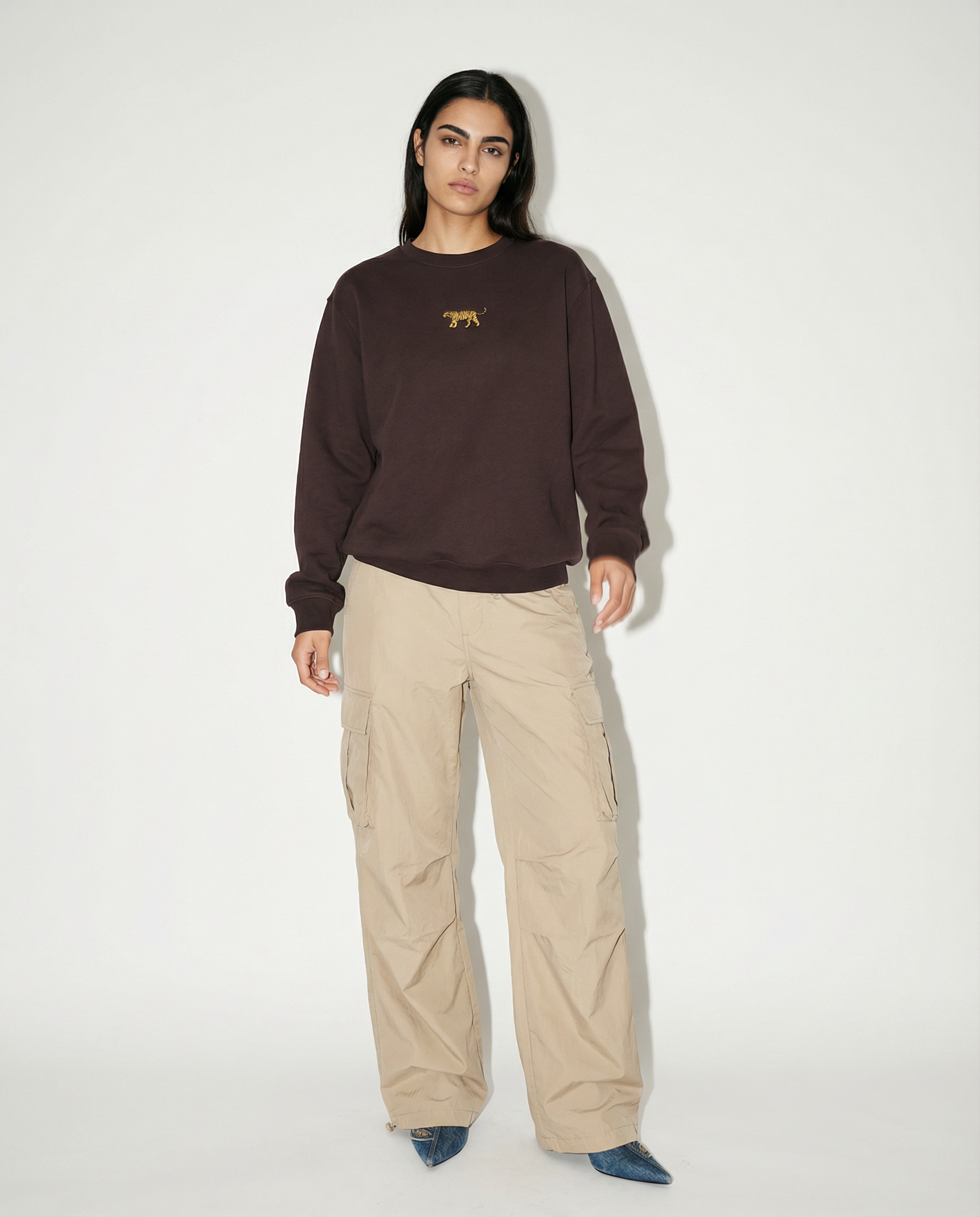 סווטשירט יוניסקס בגזרת אוברסייז רחבה ונוחה, בצבע חום שוקולד. עשוי מבדפרנץ׳ טרי עבה ורך, אידיאלי לחורף הישראלי. בחזית רקום הלוגו האיקוני : נמר זהוב בגימור מדויק.