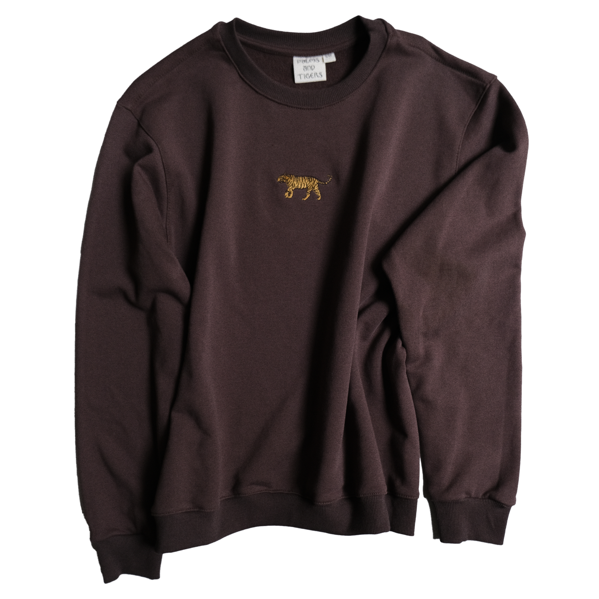 Unisex oversized sweatshirt in dark chocolate brown. Made from soft French Terry cotton, perfect for layering and for mild winter days. The front showcases our signature Palms and Tigers golden embroidered tiger logo – subtle and iconic.