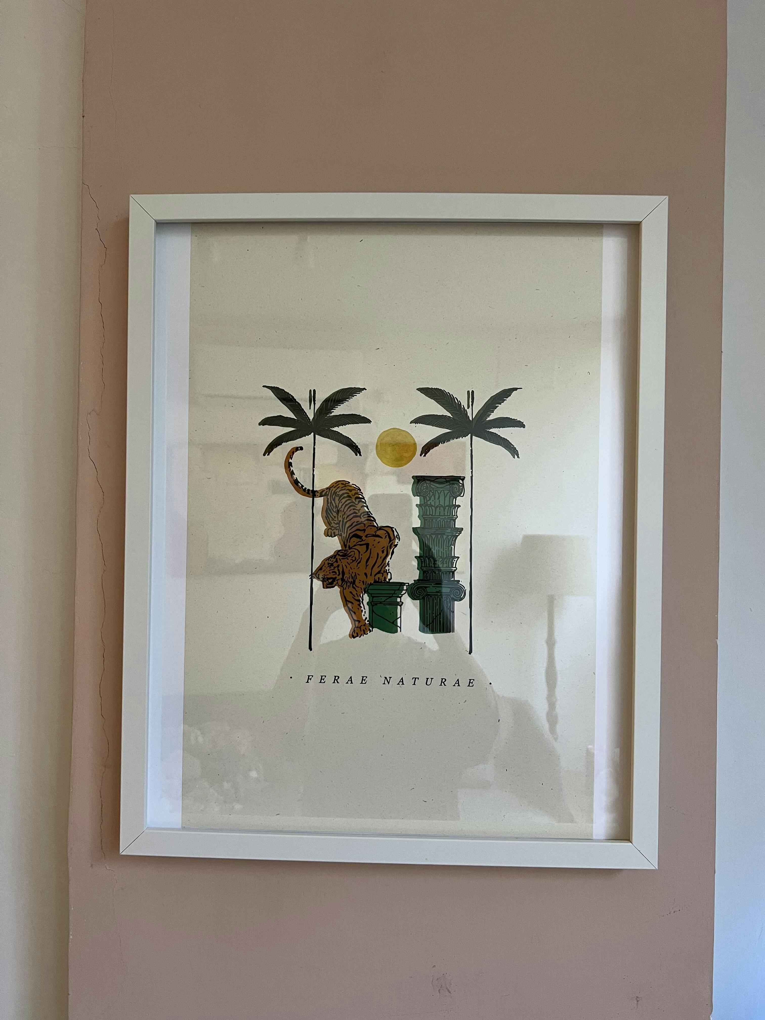 הדפס דיגיטלי בשחור, טורקיז וגווני כתום על נייר עם טקסטורה עדינה המציג קופוזיציה של נמר, עמודים ודקלים. כיתוב בלטינית ״הטבע הפראי״